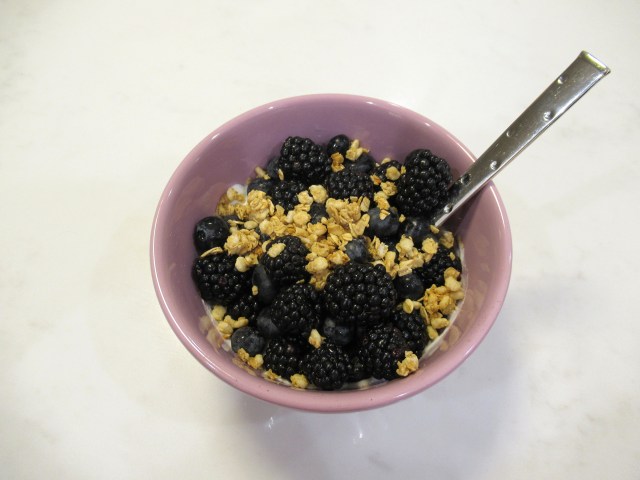 Skyr bowl – blueberries and a big scoop of One Trick Pony maple crunch peanut butter (this is the best sweet peanut butter we’ve ever had).