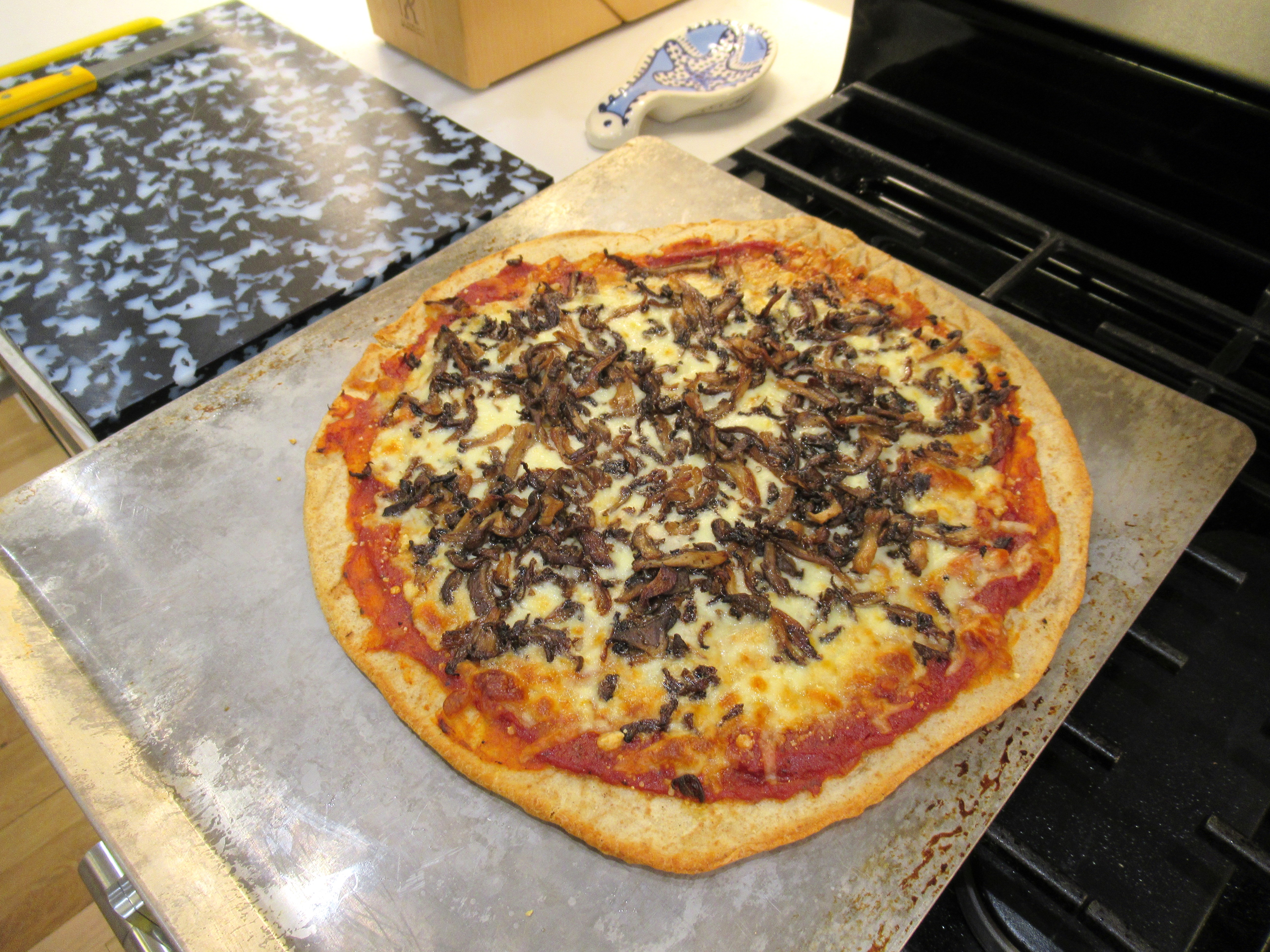 Great homemade pizza. Store-bought grilled whole-wheat crust / sauce = Trader Joe’s pizza sauce gussied up with tomato paste, 2 bulbs of confit elephant garlic, and dried basil / oyster mushrooms sauteed with salt, pepper, and butter / mozzarella and parmesan cheese. Served with roasted cauliflower.