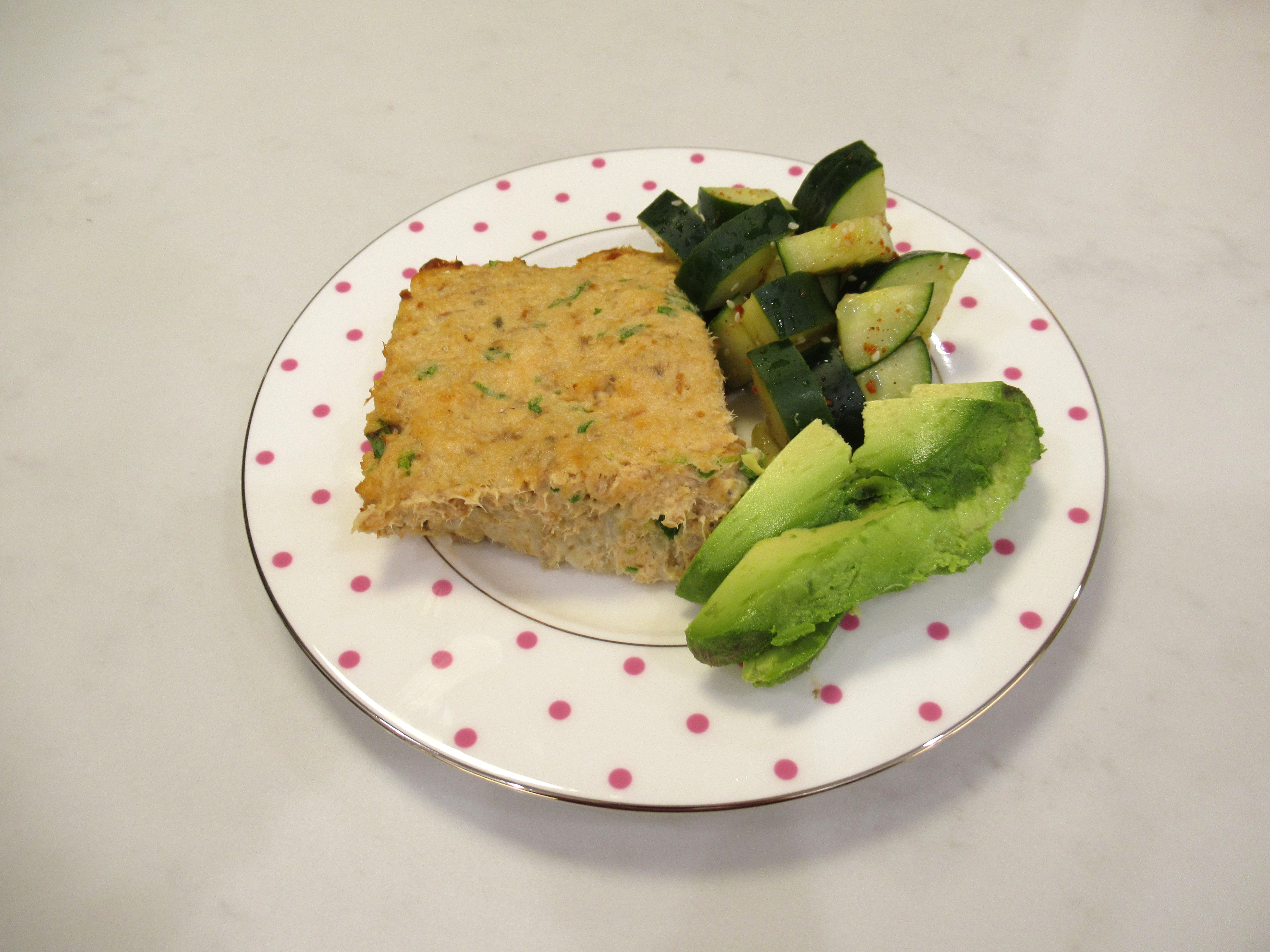 Salmon sushi bake. I used brown rice and added parmesan to that layer. Served with avocado and a quick-pickled cucumber salad.
