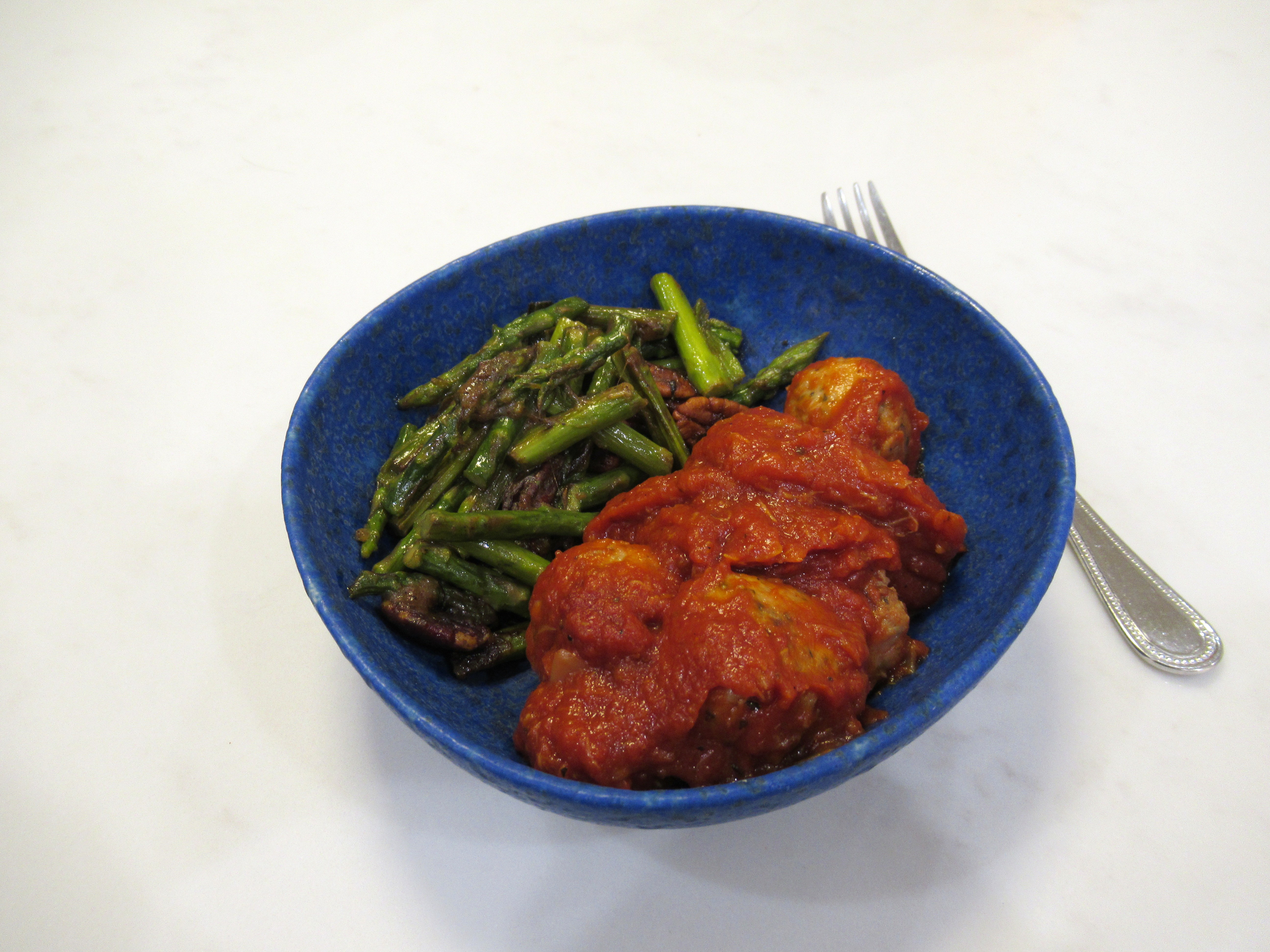 Packaged chicken meatballs (mine are better) with leftover sauce. Plus asparagus sauteed with pecans and parmesan.