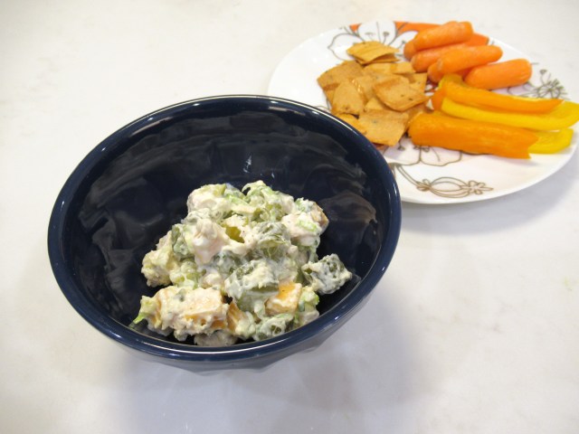 Our version of the viral pickle dip is a scoopable dinner bowl situation. A mix of chopped baked chicken, dill pickles, spicy pickles, scallion, extra-sharp cheddar, mayo, plain skyr, sweet and spicy jalapeño pickle juice, and ranch seasoning. Scooped with bell pepper, baby carrots, and Nufs hot honey crackers.
