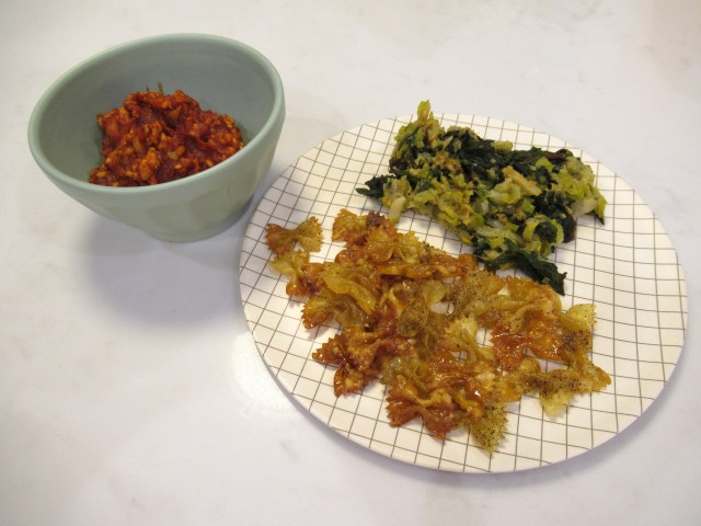 I made a batch of gussied up red sauce – Trader Joe’s pizza sauce cooked down with evoo, tomato paste, gochugaru, dried basil, and tons of roasted garlic. Served once as a dip with sauteed ground turkey and crispy baked bow-tie pasta. Plus sauteed fennel, leek, red chard, and garlic (a 10/10 combo).
