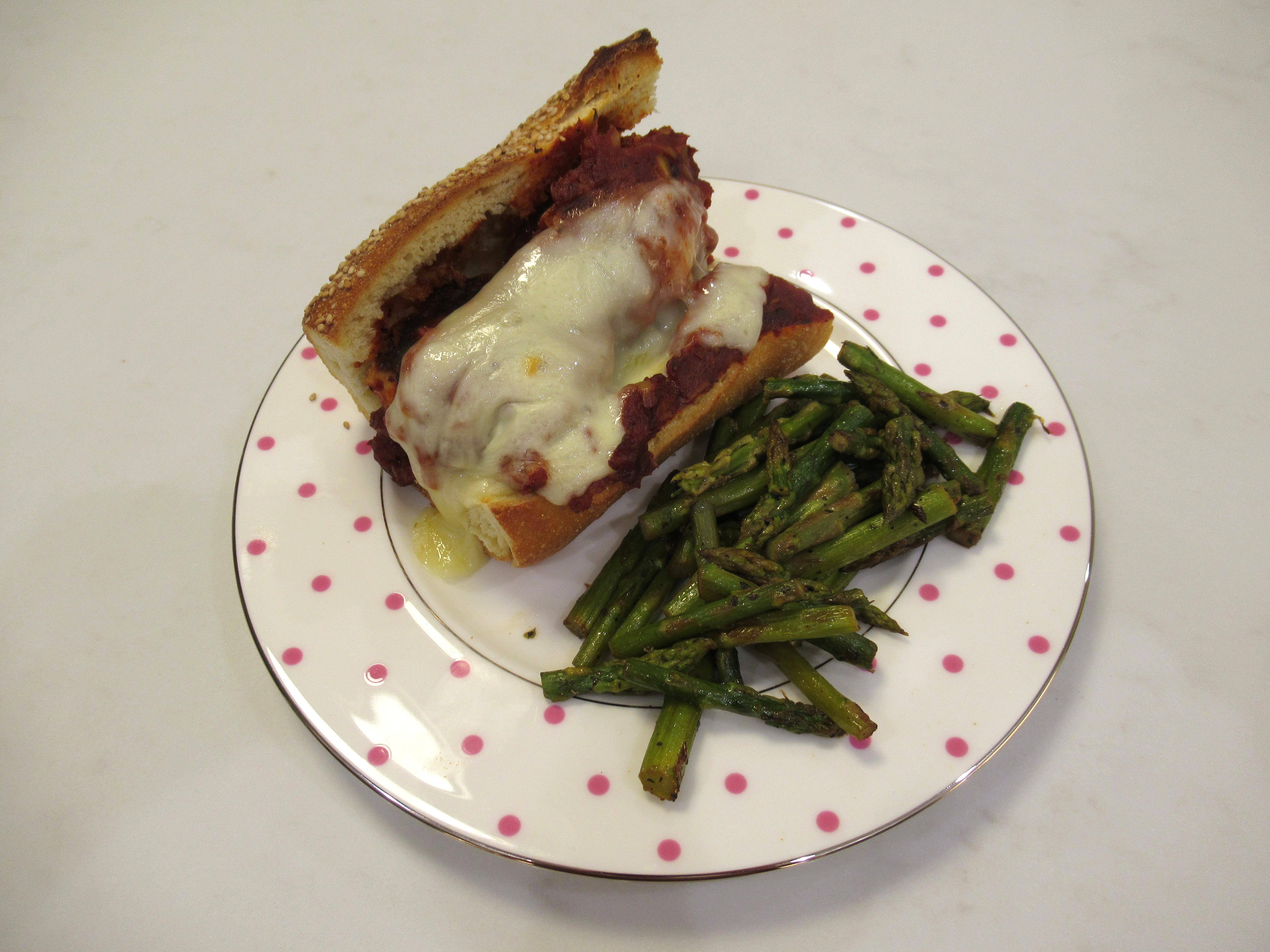And once in meatball subs. With provolone cheese and baked turkey cheese meatballs (with panade, egg, hoisin sauce, garlic powder, onion powder, pepper, and sharp cheddar in the middle). Plus sauteed asparagus with lemon, basil, and pepper.