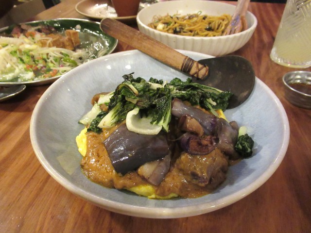 I had the kare kare omelette with braised beef cheeks, peanut stew, eggplant, bok choy, and garlic toast. Plus bites of Adam’s Filipino platter and we shared a (spicy!) mushroom noodle.