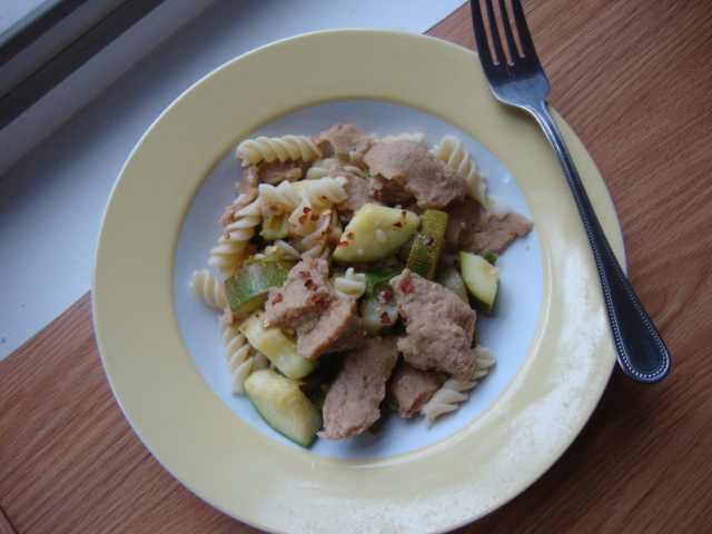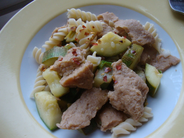 I veganized (and updated to fit our failing pantry) a recipe from “Fitness Magazine,” Lemony Fusilli with Chicken, Zucchini, and Pine Nuts. My changes to the original recipe (which is available by clicking the link in the recipe title) –
