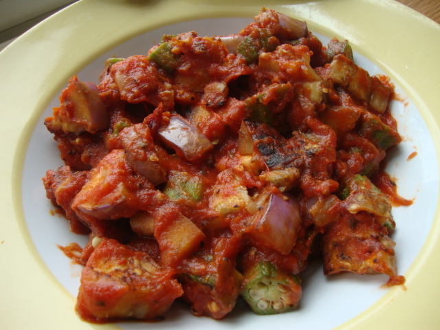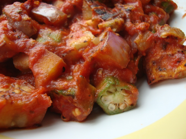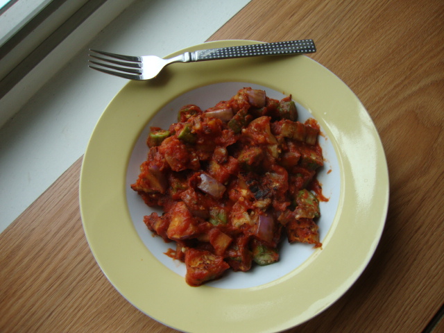 A small neon eggplant + ~3/4cup chopped okra + (too much)marinara. It is definitely the end of okra season up here, I had to pick through the bin just to find that much. I had never tried okra before this year and now it is one of my favorite veggies.