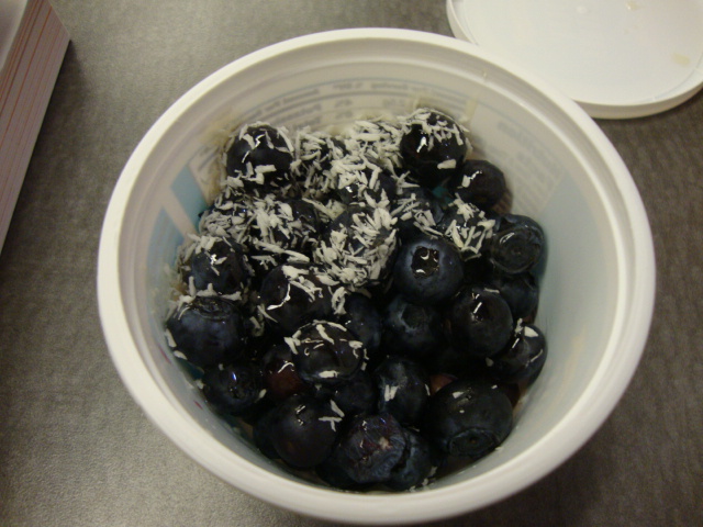 Blueberries with a drizzle of honey and unsweetened shredded coconut.