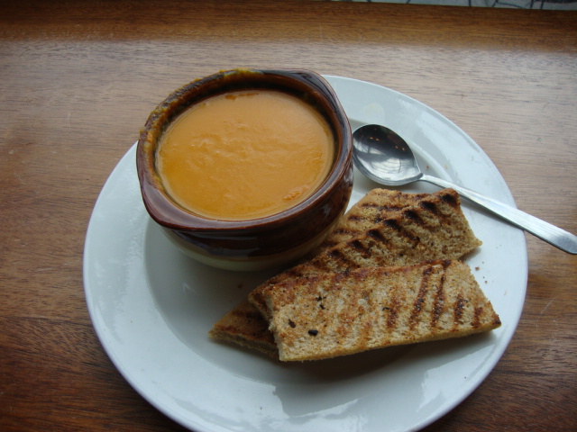 Lunch ended up being really, really good. The soup was spicy and sweet and had huge tasty chunks of carrot.