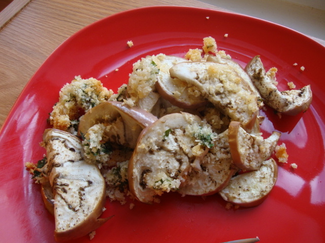 Then I downsized a recipe from Women’s Health to make a single serving of honey eggplant (I baked instead of microwaved).