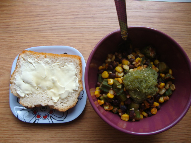 Its leftover status made this meal no less tasty, just quicker!  Veggie bowl (corn, okra, black beans, salsa),