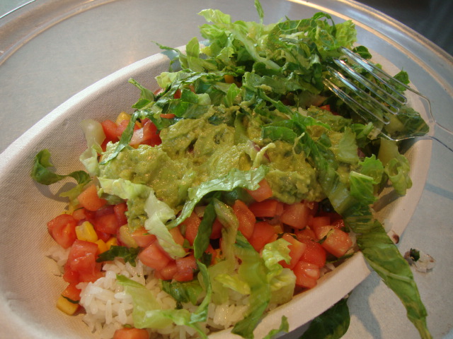 Underneath all that lettuce was rice, black beans, guacamole, roasted corn salsa, and fresh tomato salsa.