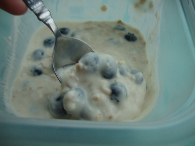 Right before we left I mixed 1/3cup raw oats, 1/2cup Silk soy milk, a Siggis plain yogurt, 2T of maple syrup, and a bunch of blueberries.