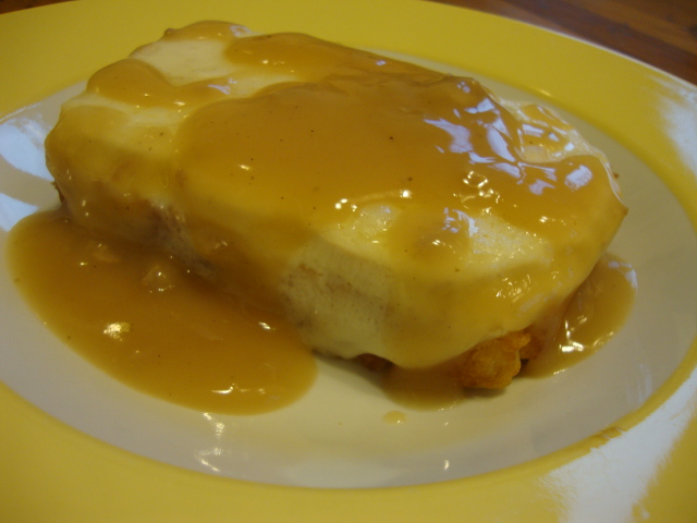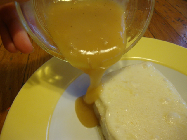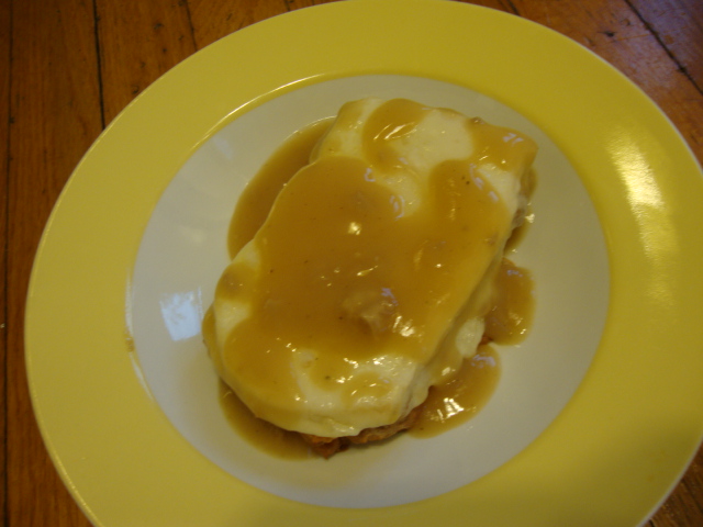 I told you I had a strange dinner in the works – an open-faced turkey sandwich with gravy. Very traditional and yet very unorthodox for our house. I topped a piece of beer bread with thick sliced turkey breast and provolone, put it into a 450* oven until the cheese was nice and melty, then topped the whole thing with fat free turkey gravy.