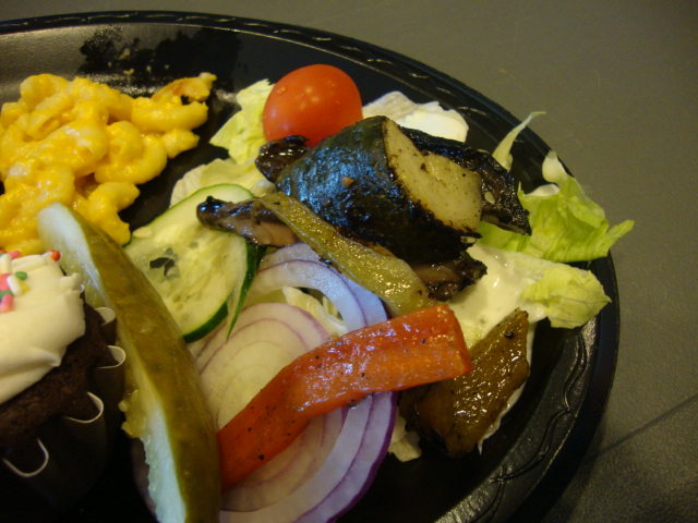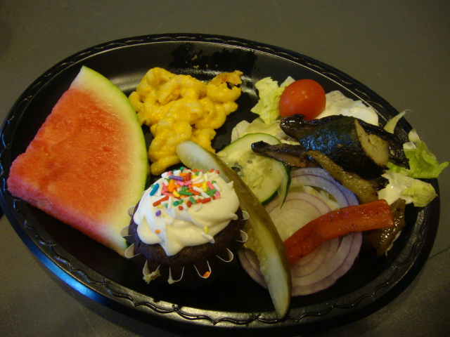 Aaaaand then the fire alarm went off and they evacuated us, which meant I threw most of my uneaten lunch in the trash.  I ate most of the salad and veggies, all of the watermelon, a bite of the macaroni, and none of the cupcake.