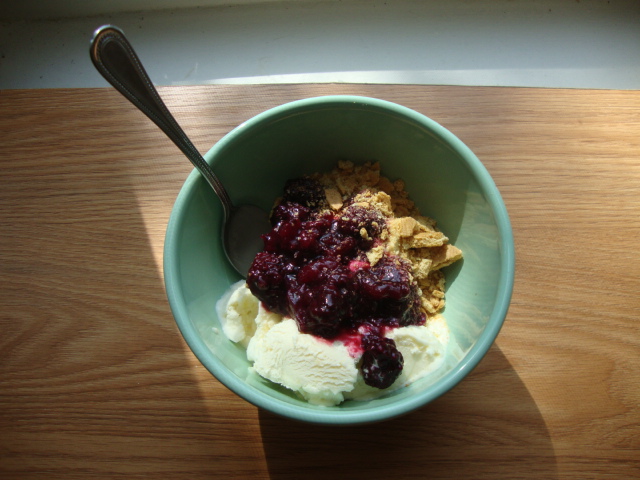 I’ve been doing some organizing but my lack of  a full lunch finally forced me to settle down for a snack.  I went with a sundae of sorts.