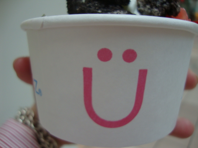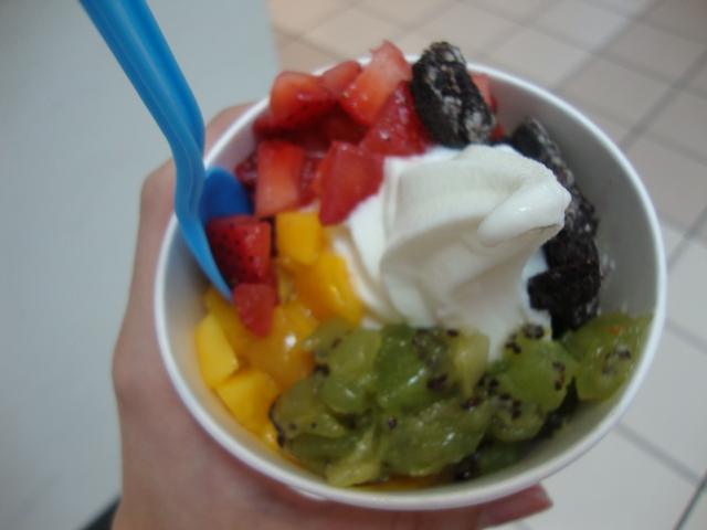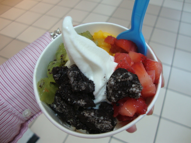 1. Wow, I just tried yogen fruz today too! You can also get frozen fruit blended in (not just mixed it) and it is awesome.