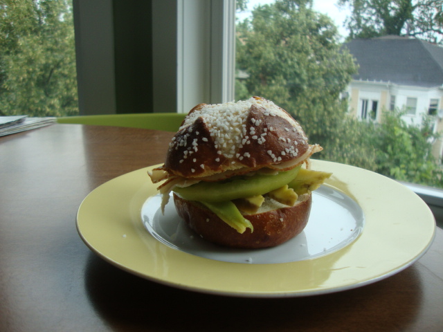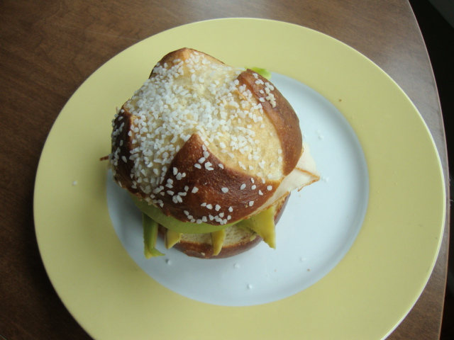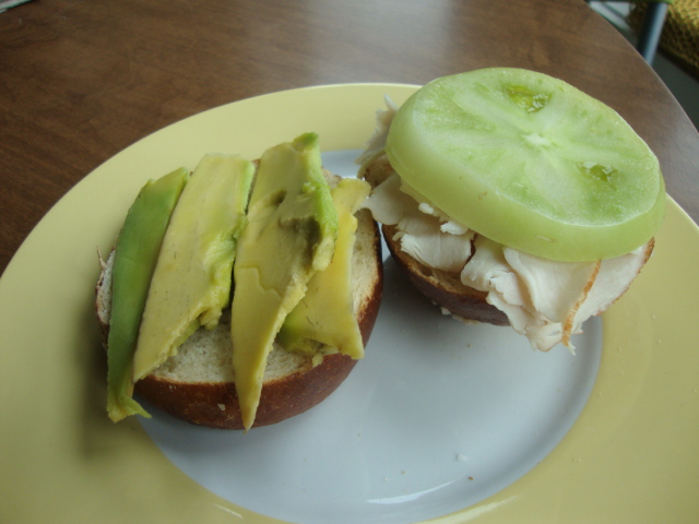 This sandwich was indeed pretty killer.  A pretzel roll with ~2oz sliced turkey, a slice of green tomato, hot pepper peach preserves, and ~1/6 of a slimcado.
