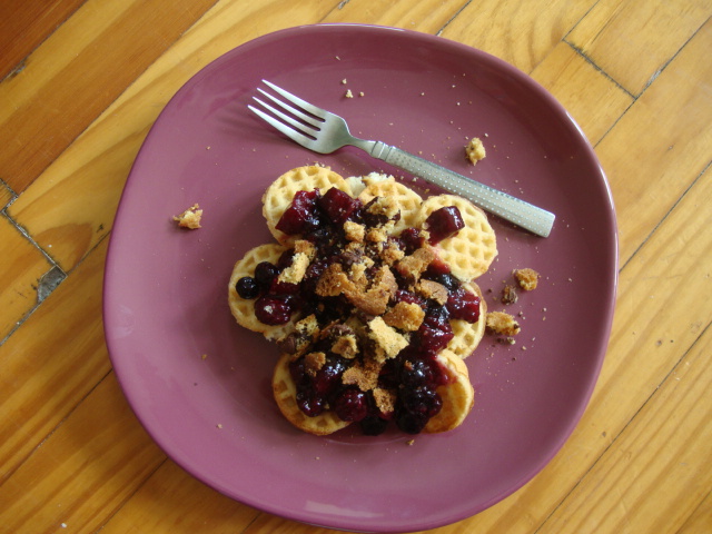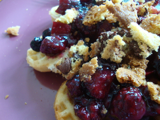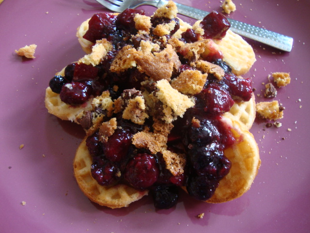 I piled up a serving of Van’s Minis Waffles and topped it with some berry topping…..and a crumbled cookie.
