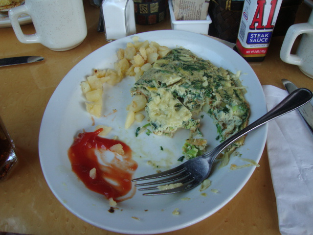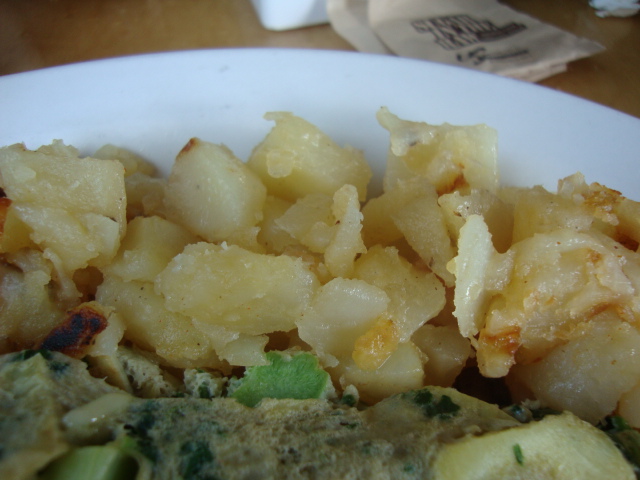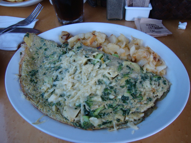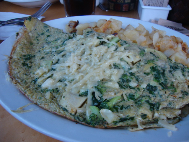 I ordered the Artichoke Omlette, which came with fresh spinach, artichoke hearts, and a a touch of basil pesto.  I also requested that they add broccoli and only use half cheese, pepperjack, i.e. there is cheese on the top but not the middle.