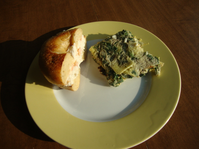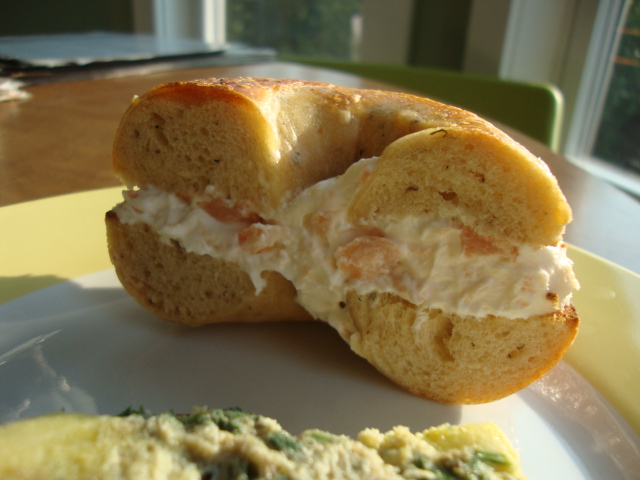 -~-Monday-~-   We had to get up super early to take my parents to the airport (boo!) so Adam and I stopped at a bagel place on the way home and got a tomato pesto bagel with salmon shmear to share.