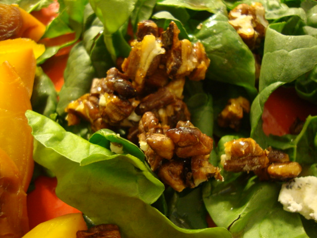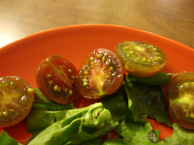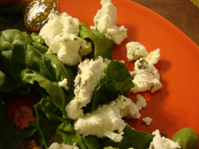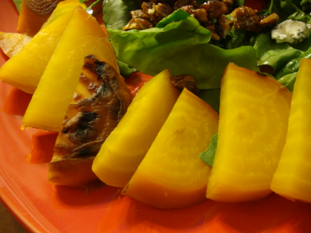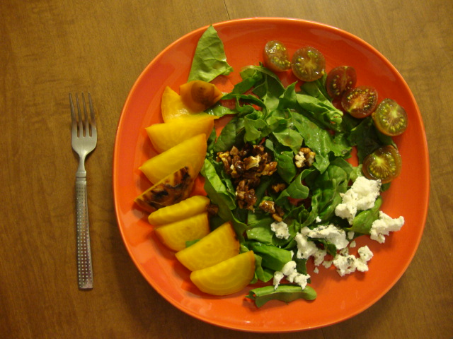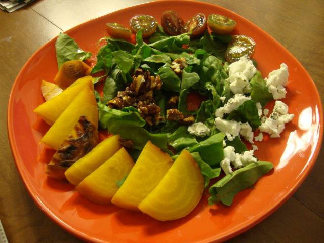 I topped a small bed of lightly dressed spinach with roasted yellow beets,