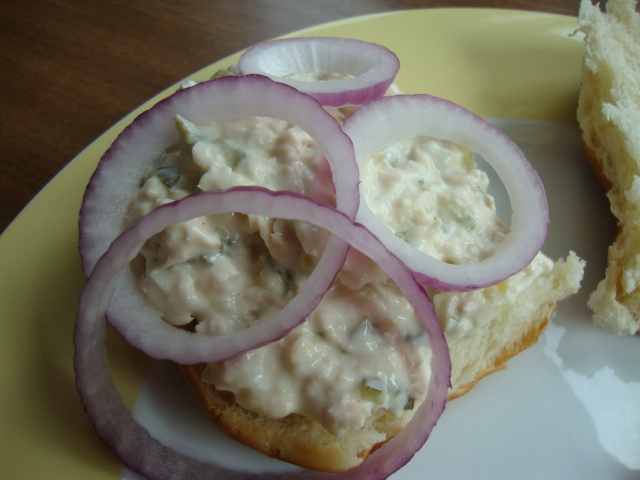 and combined half a can of tuna with miracle whip and pickle relish, on a soft bun, topped with tons of red onion.