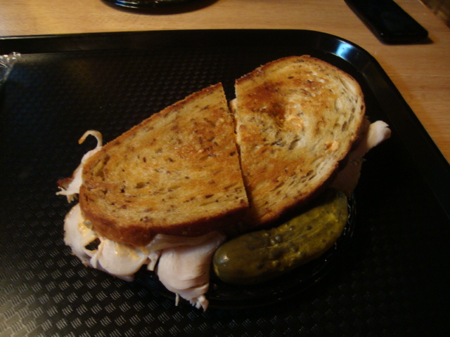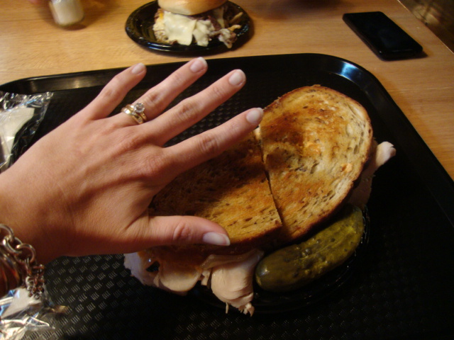 I only ate half of my reuban and I was stuffed.  Not so stuffed, however, that I couldn’t tell Adam at least a bazillion times how in love with my sandwich I was!  He ate the 2nd half (in addition to his own food!!) and quickly concurred.  There was just enough sauerkraut to add tang without slime and the thousand island dressing was rich and creamy.  I forgot to ask for no butter on my bread but in the end the bread was so perfect I’m glad I didn’t mess with it; great rye that was so satisfyingly crunchy.  Usually the turkey is an afterthought for me when I eat a rueban (thousand island dressing, rye bread, swiss cheese; who gives a hoot about the turkey?!) but we both agreed that it was the best part of the sandwich.