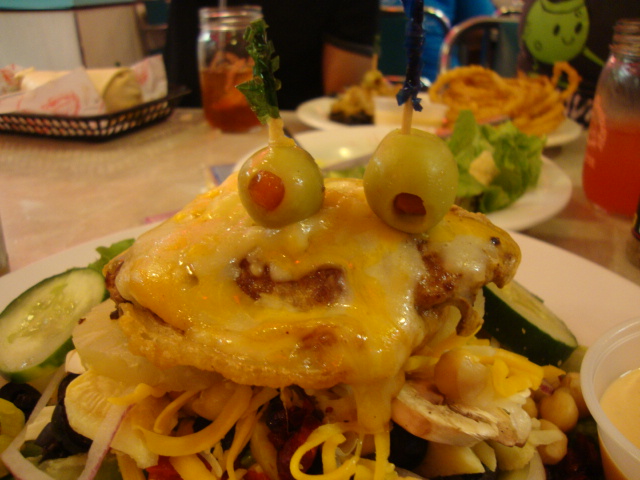 haha the olives look like eyeballs which makes the burger look like a fun ‘burger monster with eyes’ thats pretty awesome! and id love to take that stuffed burger home to use as a pillow. im sure id have some delicious dreams if i did 🙂