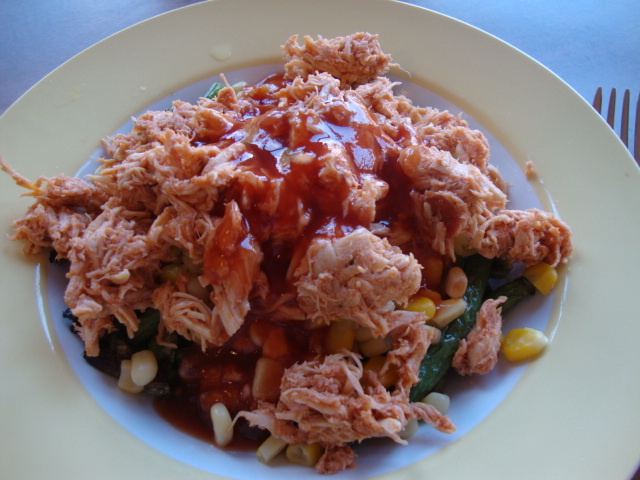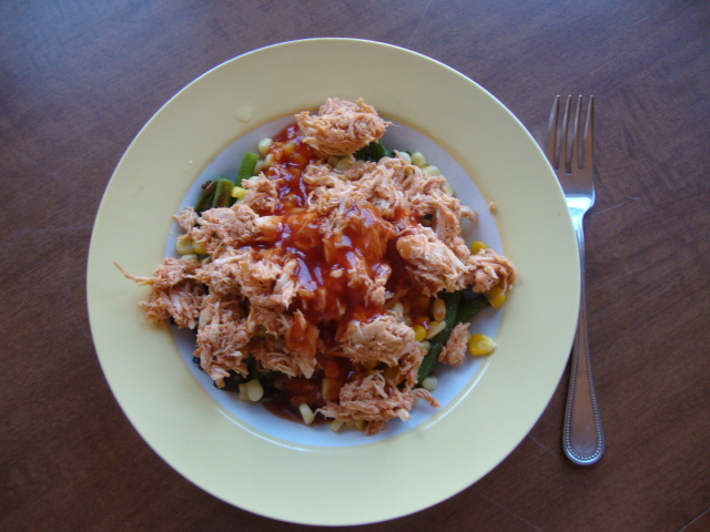 Think tasty leftovers x10billion. I topped a bed of roasted green beans with 1cup of corn, a serving of shredded bbq chicken, and some homemade bbq sauce.