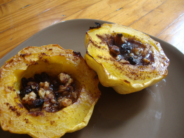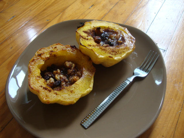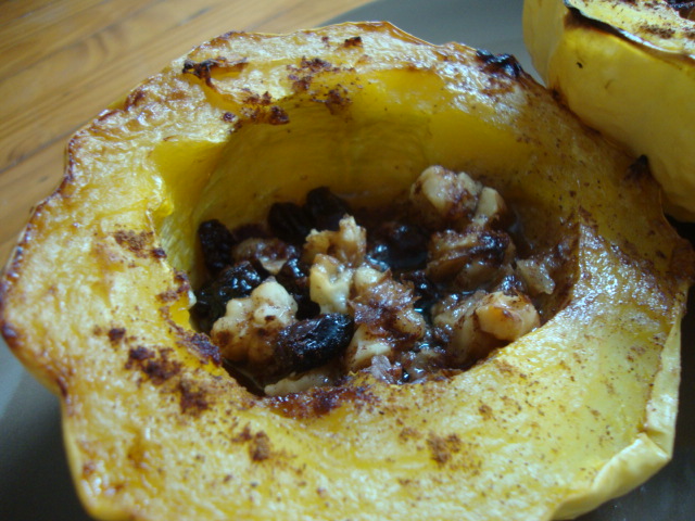 I wasn’t sure what to expect with the white squash, but when I cut it open it had a great ‘fall’ scent.  I cut it in half and scooped out the seeds and junk and then roasted it, facedown, at 400* for 30minutes.  Then I flipped it over and filled the halves with a mix of ~ 4T raisins, 3T chopped walnuts, 1/2T butter, 2t maple syrup, big shakes cinnamon.  Followed by a final 20minutes at 400*.  How’d it turn out?
