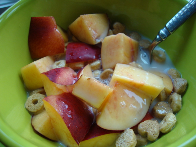 A serving of Kashi H2H topped with a chopped nectarine and Silk Almond Milk.