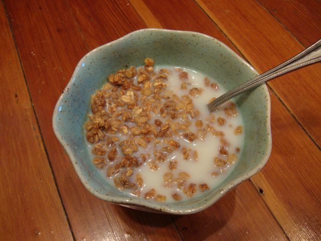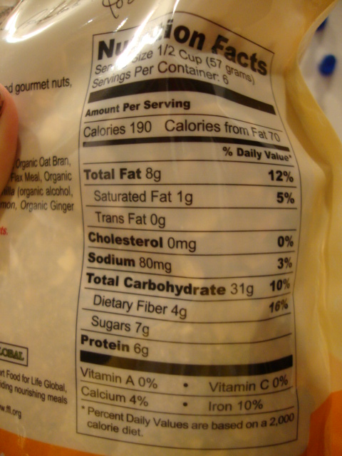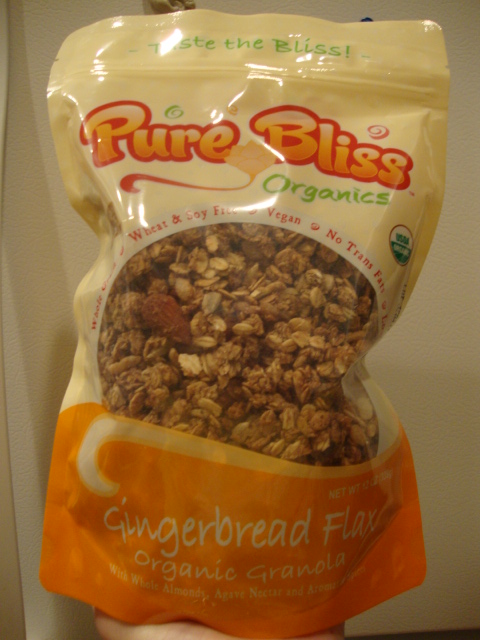 The nutritional stats were pretty sound (store bought granola can be a fat/sugar bomb), the price was right, and gingerbread?!  I ate a serving with skim milk this evening while dinner cooked.
