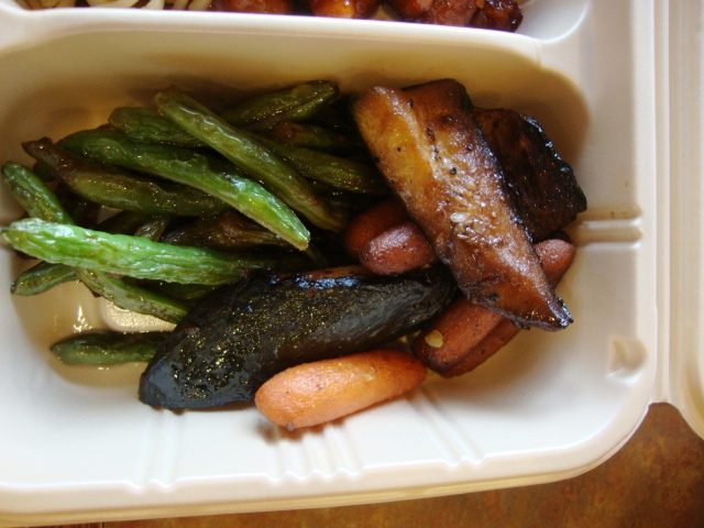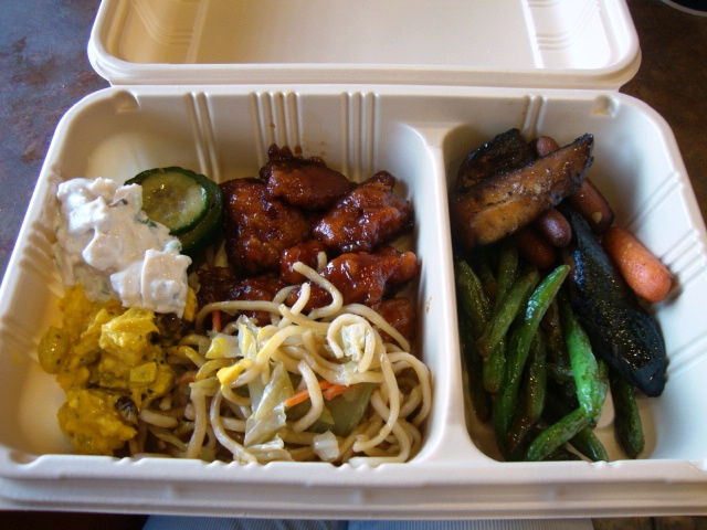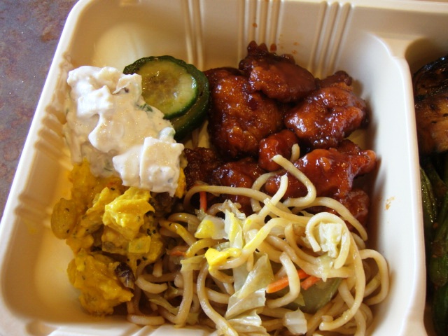 [small bites of – curried chicken salad, chicken salad, cucumber salad, sesame and general’s chicken, lo mein, Asian green beans, wok seared veggies]