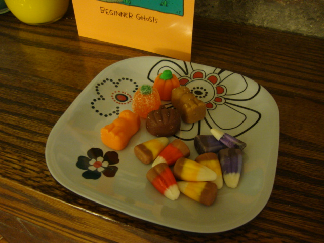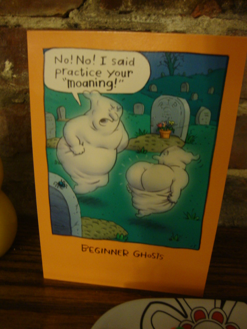 Yuuum.  I love the light brown ones, they taste like caramel!  Eaten with the funny Halloween card my grandma sent me –