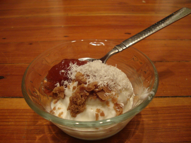 I was ravenous while we were cooking dinner so I made myself a tiny bowl of 0% Plain Oikos with homemade chocolate pb, Crofter’s strawberry spread, and a pinch of shredded coconut.
