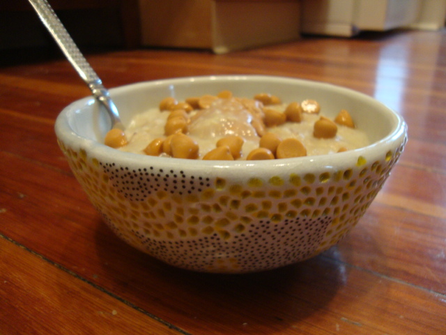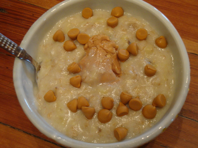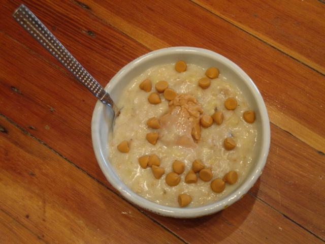 I cooked a 1/2 cup of oats with a 1/2 cup each skim milk and water, and a medium banana. Then I topped my bowl with a serving of butterscotch chips and a dollop of chunky peanut butter.
