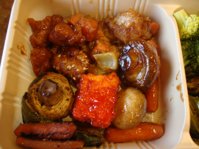 wok seared veggies, bbq tofu, and sesame chicken and shrimp.
