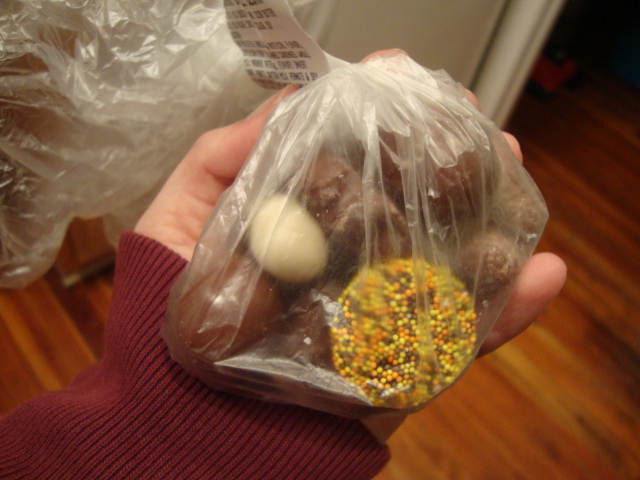 We got our weekly grocery trip in before we came home. I had to spend a certain amount of $ in the bulk bins to use a coupon so I filled a baggie with assorted chocolates.