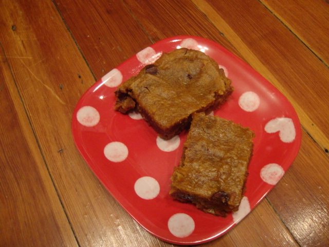 Allie’s Vegan Pumpkin Pecan Blondies. Note – I halved the oil, substituted the spices (little bit of pumpkin pie spice, lotta bit cinnamon and nutmeg), and used light brown sugar and these still came out fabulously!