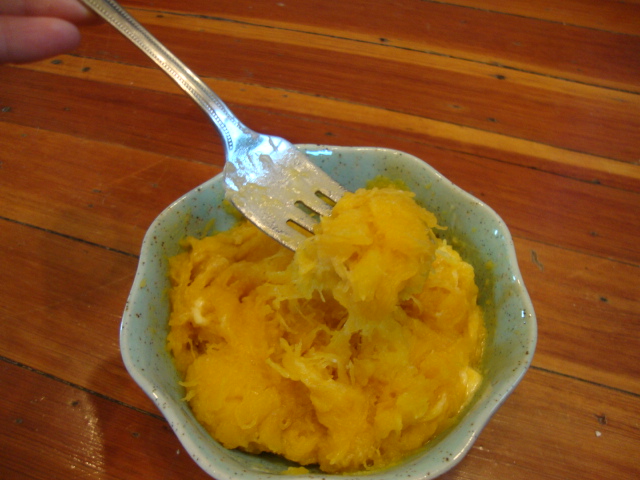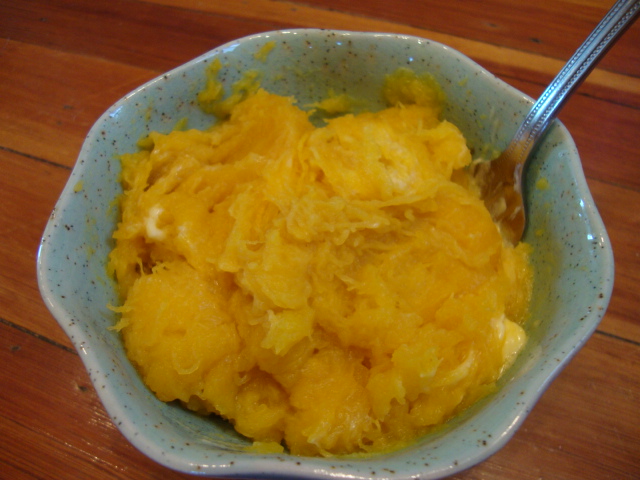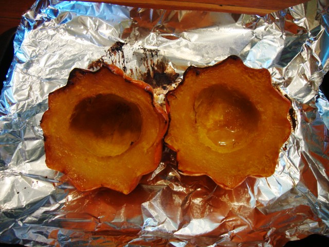 Yesterday I roasted this delightful orange acorn squash with a teeny bit of honey and salt.
