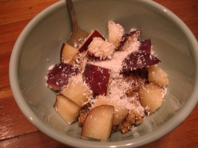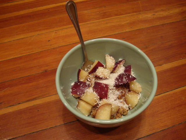 Low fat plain yogurt topped with 1/4 cup gingerbread granola, 2tsp maple syrup, a sliced plum, and a sprinkle of unsweetened shredded coconut.