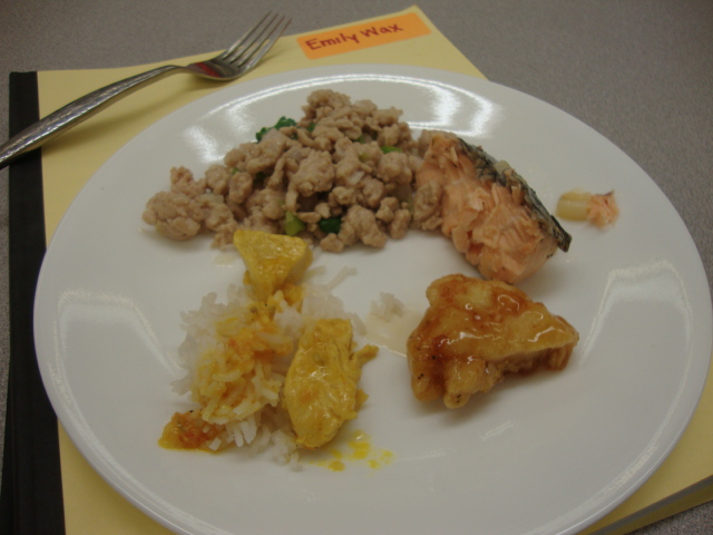 Food lab was a lot of fun today too. It was the Meat/Fish/Poultry lab so I was feeling a little anxious about having to cook pork or red meat but luckily my group was assigned fish and fowl only. We made pan cooked salmon with fresh tomatoes and Laab (a spicy Thai chicken salad).