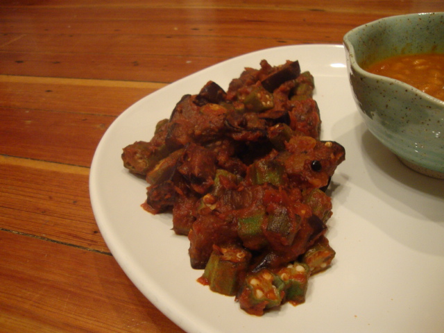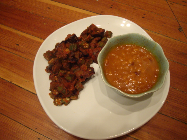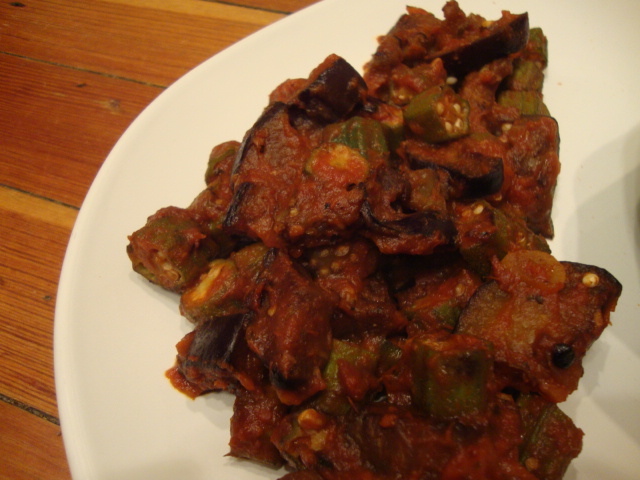 Tonight I did half a small eggplant and a handful of chopped okra with Worcestershire and marinara.