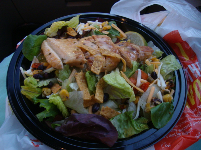 Adam picked me up from class this afternoon and we got on the road right away.  The stretch of highway between here and Michael’s house is positively barren foodwise but I finally accepted that it would be McDonald’s or nothing.  Thankfully I remembered that their salads are actually not bad.