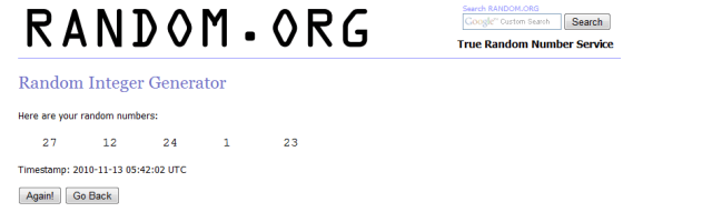 Finally, the winners of my Terra giveaway, via a random integer generator –