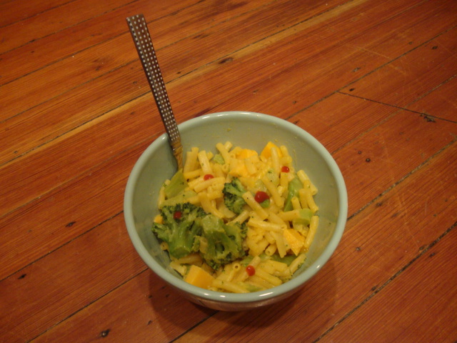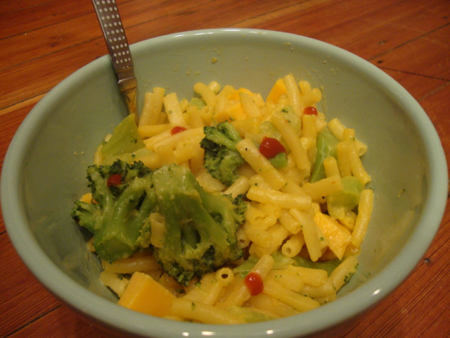 Dinner was simple simple, boxed mac and cheese gussied up with broccoli, 1oz of sharp cheddar, and a sprinkle of Sriracha.