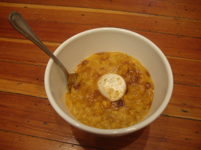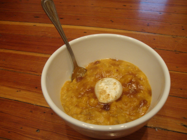 Readers, even if you don’t listen to another word I say, please, please try this bowl! You bring your liquids to a low simmer, then carefully stir in the rest of your ingredients. Stir continuously with a wooden spoon (breaking up the banana with the back of your spoon) until most of the liquid is gone and you’ve reached the consistency you like. Then top and give the entire bowl a 20second spin in the microwave to get the toppings nice and melty. The banana endows this great sweetness, the sugar starts to brulee, and the cream cheese gives the perfect amount of tang. It is life-changing.