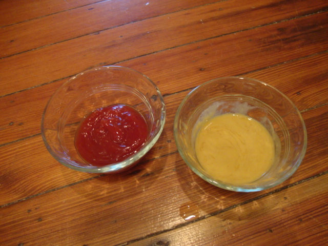 with ketchup and homemade honey mustard.