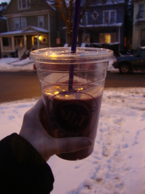 For two (I love that Adam likes these!) we mixed 2 cups of frozen strawberries and 2 cups of chocolate peppermint soy milk.  I know that picture is a little grim, but that what it’s like outside in Buffalo at 7am and 12*.