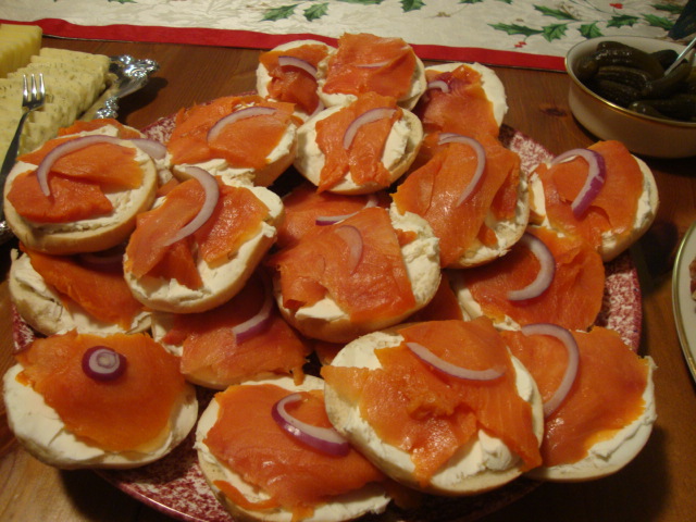 Mini bagels with cream cheese and lox.